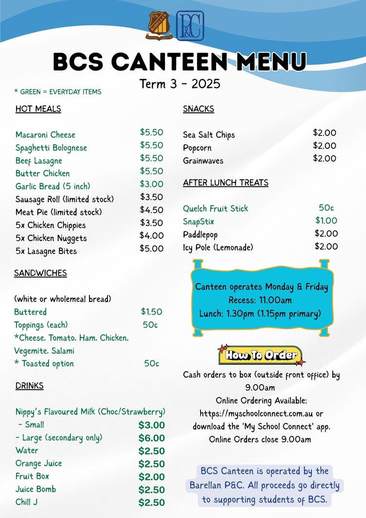 Our school canteen offers healthy, affordable food options for students. The canteen is managed by the P&C, and operates Monday & Friday at Recess (11am) and Lunch (1:15pm-1:30pm).